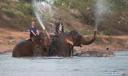 People ride on elephants during the Elephant Festival in a tributary of Mekong River in northern Lao province of Xayaboury, on Feb. 22, 2020. The annual Elephant Festival lasts from Feb. 22 to Feb. 28 this year. (Photo by Kaikeo Saiyasane/Xinhua)