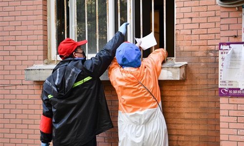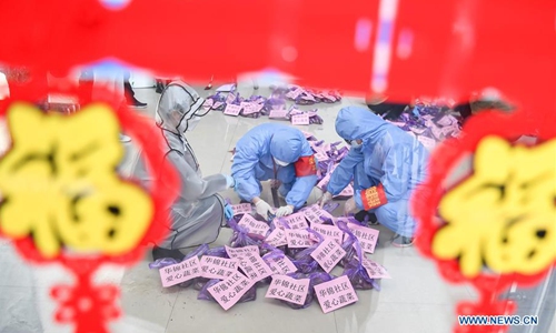 Volunteers deliver vegetables to an elderly resident of Huajin community in Wuchang District of Wuhan, central China's Hubei Province, Feb. 23, 2020. More than 10,000 people in Wuhan have applied for a volunteer project, shortly after its kick-off on Sunday morning. Authorities announced the project of recruiting volunteers to buy and deliver groceries and other essentials to local residents, as it is difficult to buy daily necessity for some residents after the lockdown of the city. (Xinhua/Cheng Min)