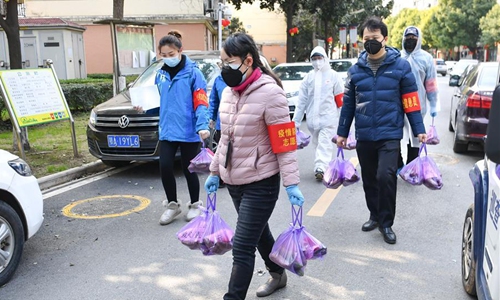 Volunteers deliver vegetables to residents of Huajin community in Wuchang District of Wuhan, central China's Hubei Province, Feb. 23, 2020. More than 10,000 people in Wuhan have applied for a volunteer project, shortly after its kick-off on Sunday morning. Authorities announced the project of recruiting volunteers to buy and deliver groceries and other essentials to local residents, as it is difficult to buy daily necessity for some residents after the lockdown of the city. (Xinhua/Cheng Min)