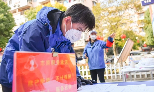 A resident applies for a volunteer project in Wuchang District of Wuhan, central China's Hubei Province, Feb. 23, 2020. More than 10,000 people in Wuhan have applied for a volunteer project, shortly after its kick-off on Sunday morning. Authorities announced the project of recruiting volunteers to buy and deliver groceries and other essentials to local residents, as it is difficult to buy daily necessity for some residents after the lockdown of the city. (Xinhua/Cheng Min)