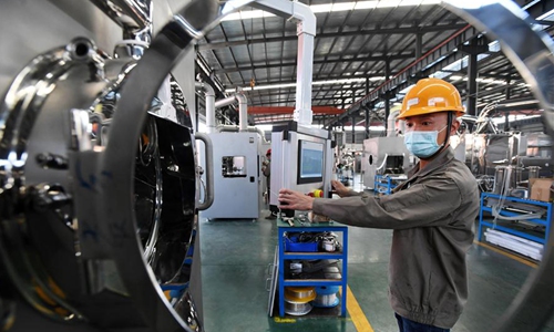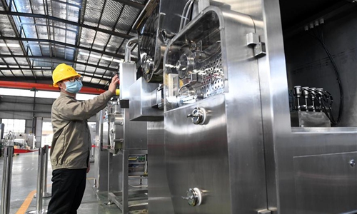 A worker works on a production line to produce dry granulators, which will be supplied to drug manufacturers in Shanghai and other cities to help combat the novel coronavirus, at Wanshen Pharmaceutical Machinery Co., Ltd. in Yichun, east China's Jiangxi Province, Feb. 24, 2020. The government of Yichun has coordinated with the company to ensure the production at full capacity amid epidemic prevention and control efforts. (Photo by Zhou Liang/Xinhua)