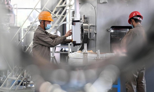 Workers work on a production line to produce dry granulators, which will be supplied to drug manufacturers in Shanghai and other cities to help combat the novel coronavirus, at Wanshen Pharmaceutical Machinery Co., Ltd. in Yichun, east China's Jiangxi Province, Feb. 24, 2020. The government of Yichun has coordinated with the company to ensure the production at full capacity amid epidemic prevention and control efforts. (Photo by Zhou Liang/Xinhua)