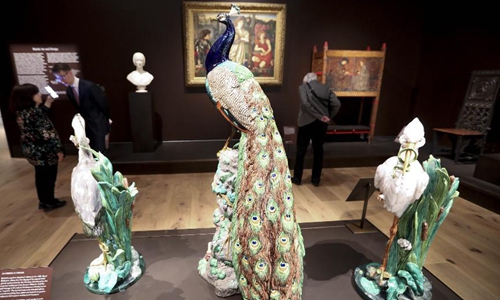 Visitors view exhibits during the press preview of the Galleries for British Decorative Arts and Design in the Metropolitan Museum of Art in New York, the United States, Feb. 24, 2020. The Galleries for British Decorative Arts and Design in New York's Metropolitan Museum of Art (The Met) will reopen to the public on March 2, according to a press preview on Monday. (Xinhua/Wang Ying)