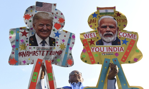 Kite-maker Jagmohan Kanojia (center) poses with kites decorated with the pictures of US President Donald Trump (left) and India's Prime Minister Narendra Modi (right), in Amritsar on Sunday, ahead of Trump's visit to India. Photo: AFP