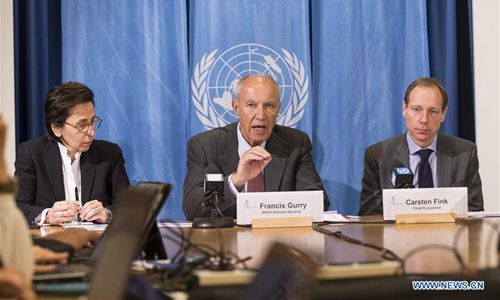 World Intellectual Property Organization (WIPO) Director General Francis Gurry (center) speaks during a press conference in Geneva, Switzerland, March 18, 2019. File Photo:Xinhua