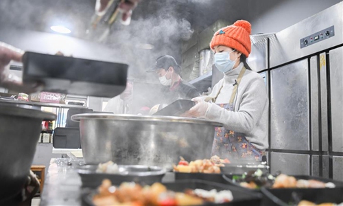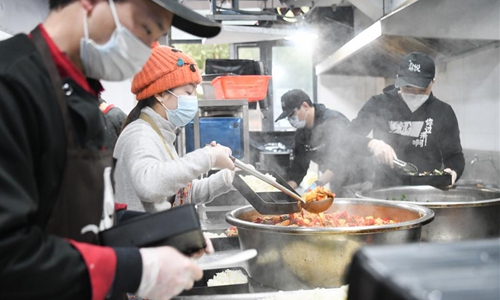 Ms Liu (2nd L), a volunteer, and her teammates package food for medical workers in Wuhan, central China's Hubei Province, Feb. 26, 2020. Liu, a 24-year-old volunteer from Sichuan Province, drove dozens of hours to Wuhan on Feb. 3 with chefs and food materials to cook and deliver food for the medical workers fighting against the novel coronavirus disease (COVID-19) in the epidemic-hit city for free. Every day, about 400 to 600 sets of food can be delivered to hospitals by the team she is leading. Except providing food, she also collects and delivers other donated materials for hospitals. She won herself an affectionate nickname "Raincoat Sister" from the medical workers as she had to wear raincoat due to the lack of protective suits. She said she is determined to hold on till the end of the epidemic. (Xinhua/Cheng Min)