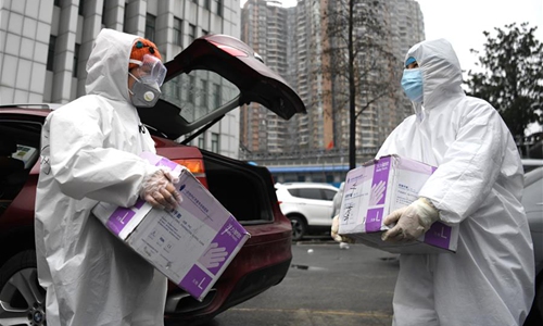 Ms Liu (L), a volunteer, hands over donated materials at a hospital in Wuhan, central China's Hubei Province, Feb. 26, 2020. Liu, a 24-year-old volunteer from Sichuan Province, drove dozens of hours to Wuhan on Feb. 3 with chefs and food materials to cook and deliver food for the medical workers fighting against the novel coronavirus disease (COVID-19) in the epidemic-hit city for free. Every day, about 400 to 600 sets of food can be delivered to hospitals by the team she is leading. Except providing food, she also collects and delivers other donated materials for hospitals. She won herself an affectionate nickname "Raincoat Sister" from the medical workers as she had to wear raincoat due to the lack of protective suits. She said she is determined to hold on till the end of the epidemic. (Xinhua/Cheng Min)