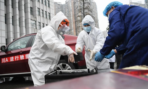 Ms Liu (1st L), a volunteer, takes out food from a container at a hospital in Wuhan, central China's Hubei Province, Feb. 26, 2020. Liu, a 24-year-old volunteer from Sichuan Province, drove dozens of hours to Wuhan on Feb. 3 with chefs and food materials to cook and deliver food for the medical workers fighting against the novel coronavirus disease (COVID-19) in the epidemic-hit city for free. Every day, about 400 to 600 sets of food can be delivered to hospitals by the team she is leading. Except providing food, she also collects and delivers other donated materials for hospitals. She won herself an affectionate nickname "Raincoat Sister" from the medical workers as she had to wear raincoat due to the lack of protective suits. She said she is determined to hold on till the end of the epidemic. (Xinhua/Cheng Min)