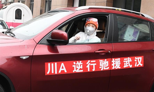 Ms Liu, a volunteer, is seen in her car in Wuhan, central China's Hubei Province, Feb. 26, 2020. Liu, a 24-year-old volunteer from Sichuan Province, drove dozens of hours to Wuhan on Feb. 3 with chefs and food materials to cook and deliver food for the medical workers fighting against the novel coronavirus disease (COVID-19) in the epidemic-hit city for free. Every day, about 400 to 600 sets of food can be delivered to hospitals by the team she is leading. Except providing food, she also collects and delivers other donated materials for hospitals. She won herself an affectionate nickname "Raincoat Sister" from the medical workers as she had to wear raincoat due to the lack of protective suits. She said she is determined to hold on till the end of the epidemic. (Xinhua/Cheng Min)