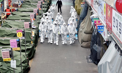 Staff members disinfect a market in Daegu, South Korea, Feb. 23, 2020. As of 4:00 p.m. local time, the number of infected patients in South Korea totaled 602, up 169 from the previous day. The Korea Centers for Disease Control and Prevention (KCDC) has updated the figure twice a day at 10:00 a.m. and 5:00 p.m. local time. The death toll rose from two to five. (NEWSIS/Handout via Xinhua)