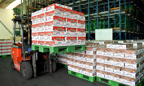 An employee works in a dairy enterprise in Xi'an, northwest China's Shaanxi Province, Feb. 26, 2020. Dairy enterprises in Xi'an took measures to ensure the supply amid novel coronavirus control and prevention efforts. (Xinhua/Liu Xiao)