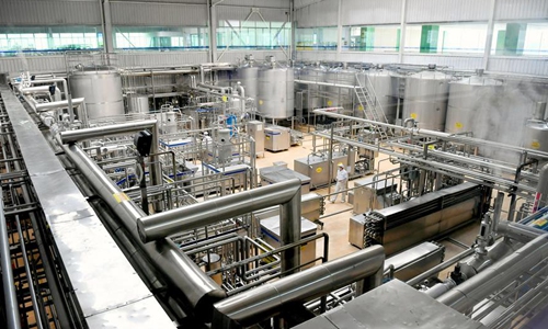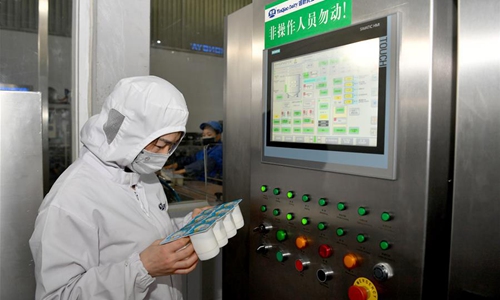 Workers work in a dairy enterprise in Xi'an, northwest China's Shaanxi Province, Feb. 26, 2020. Dairy enterprises in Xi'an took measures to ensure the supply amid novel coronavirus control and prevention efforts. (Xinhua/Liu Xiao)