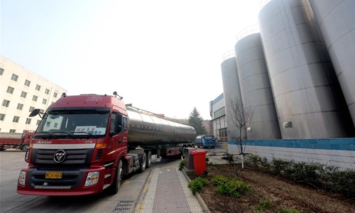 A lorry waits for fresh milk in a dairy enterprise in Xi'an, northwest China's Shaanxi Province, Feb. 26, 2020. Dairy enterprises in Xi'an took measures to ensure the supply amid novel coronavirus control and prevention efforts. (Xinhua/Liu Xiao)
