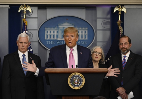 US President Donald Trump, flanked by Health and Human Services Secretary Alex Azar (right), US Vice President Mike Pence (left) and CDC Principal Deputy Director Anne Schuchat, holds a news conference on the COVID-19 outbreak at the White House on Wednesday. Trump defended his administration's response to the novel coronavirus. Photo: AFP