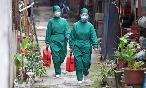 Doctor Hu Xiaoling (R) with her colleague delivers medicines to a household in Nanchang, east China's Jiangxi Province, Feb. 26, 2020. (Xinhua/Peng Zhaozhi)