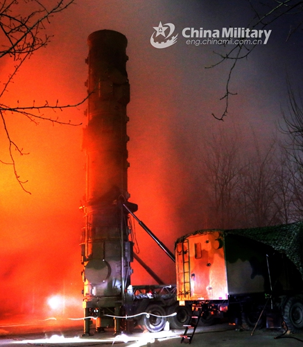 A truck-mounted DF-21A medium-range ballistic missile system attached to a missile brigade under the PLA Rocket Force is erected at night during a night training exercise in late February 6, 2020. Photo: China Military