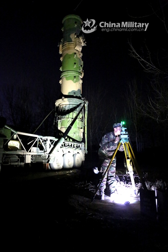 A soldier assigned to a missile brigade under the PLA Rocket Force operates an optical sighting device to assist the erection of a DF-21A medium-range ballistic missile system during a night training exercise in late February, 2020. Photo: China Military