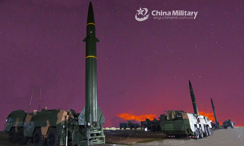 Soldiers assigned to a missile brigade under the PLA Rocket Force prepare to erect ballistic missile systems into positions during a training exercise in late February, 2020. Photo: China Military