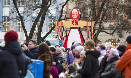 People stroll in the street during the Maslenitsa Festival to celebrate the end of winter and mark the arrival of spring, in Riga, Latvia, Feb. 29, 2020. (Photo by Edijs Palens/Xinhua)