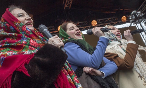 People sing in chorus during the Maslenitsa Festival to celebrate the end of winter and mark the arrival of spring in Riga, Latvia, Feb. 29, 2020. (Photo by Edijs Palens/Xinhua)