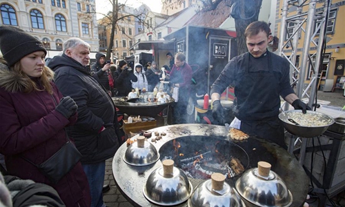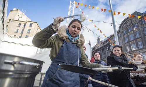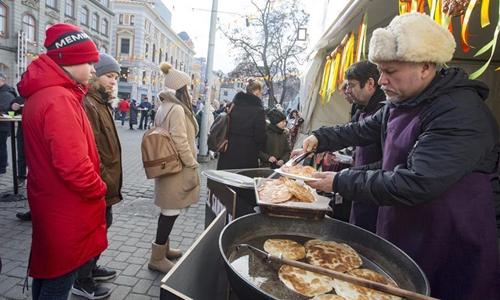 A vendor cooks street food during the Maslenitsa Festival to celebrate the end of winter and mark the arrival of spring in Riga, Latvia, Feb. 29, 2020. (Photo by Edijs Palens/Xinhua)