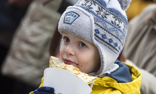 A child eats street food during the Maslenitsa Festival to celebrate the end of winter and mark the arrival of spring in Riga, Latvia, Feb. 29, 2020. (Photo by Edijs Palens/Xinhua)