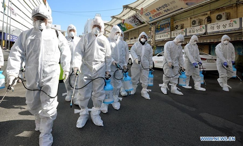 Staff members disinfect a market in Daegu, South Korea, Feb. 23, 2020. As of 4:00 p.m. local time, the number of infected patients in South Korea totaled 602, up 169 from the previous day. The Korea Centers for Disease Control and Prevention (KCDC) has updated the figure twice a day at 10:00 a.m. and 5:00 p.m. local time. The death toll rose from two to five. (NEWSIS/Handout via Xinhua)