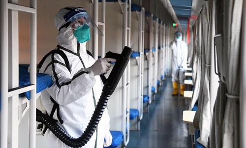 Staff members disinfect facilities on the train K5227 which runs from Beijing West Railway Station to Qinghecheng Railway Station of Xingtai, north China's Hebei Province, Jan. 30, 2020. (Xinhua/Ren Chao)