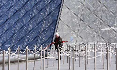 File photo taken on March 11, 2019 shows a man standing in front of the Louvre Museum in Paris, France. The Louvre Museum was shut down on March 1 due to the spreading coronavirus epidemic. (Xinhua/Gao Jing)