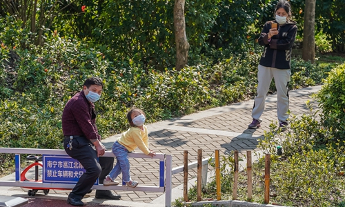 A family relaxes at a local park in Nanning, South China's Guangxi Zhuang Autonomous Region on Monday. The COVID-19 epidemic keeps many people indoors while those who go out to enjoy the weather wear face masks. Photo: cnsphoto