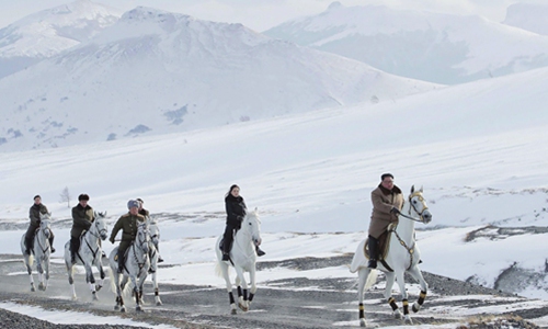 Photo released by North Korea's official Korean Central News Agency on Wednesday shows North Korean leader Kim Jong-un (right) on a horse as he visits battle sites at Mount Paektu, Ryanggang. Photo: AFP