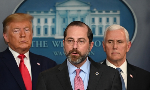 Health and Human Services Secretary Alex Azar (center) speaks during a press conference on the COVID-19 outbreak as US President Donald Trump (left) and US Vice President Mike Pence look on at the White House in Washington, DC on Sunday. Photo: AFP