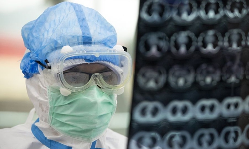Doctor Zheng Wanli checks a patient's CT image at a temporary hospital in Jiangxia District in Wuhan, central China's Hubei Province, Feb. 25, 2020.(Xinhua/Shen Bohan)