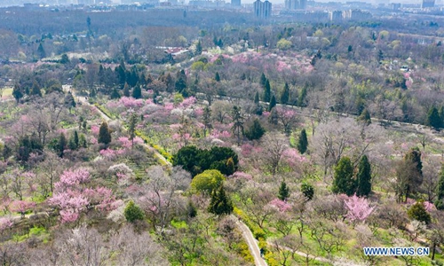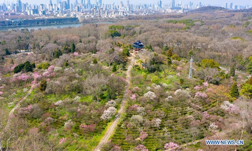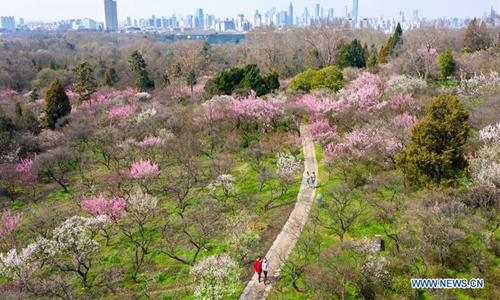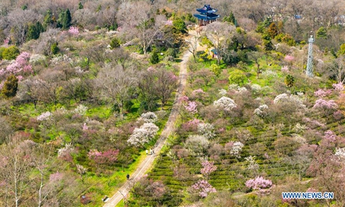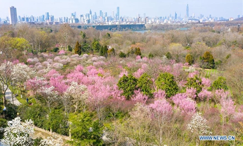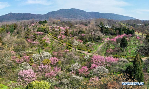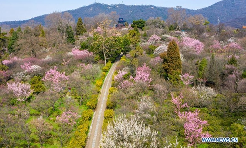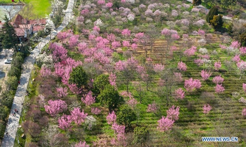 Aerial photo taken on March 2, 2020 shows the plum blossom on Meihua Mountain in Nanjing, capital of east China's Jiangsu Province. (Xinhua/Li Bo)