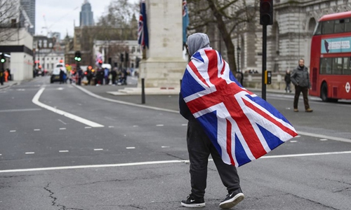 A supporter of a pro-Brexit group walks down Whitehall in London, Britain, on Jan. 31, 2020. (Photo by Stephen Chung/Xinhua)