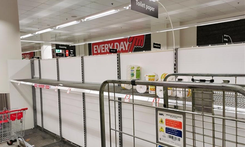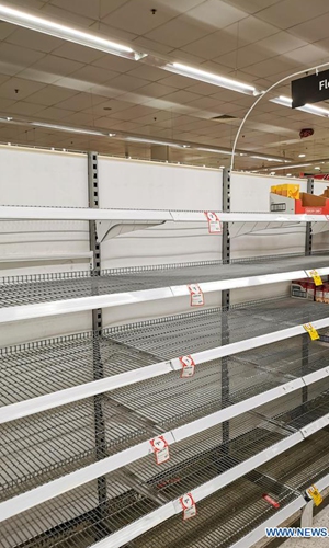 Photo taken on March 2, 2020 shows the empty shelf for tissue paper in a super market in Sydney, Australia. Australia's first person-to-person transmissions of COVID-19 were confirmed in the State of New South Wales (NSW) on Monday, with two people contracting the disease while on Australian soil. (Xinhua/Bai Xuefei)
