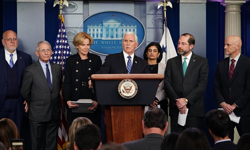 US Vice President Mike Pence (center) speaks along with members of the Coronavirus Task Force during a press briefing at the White House in Washington, DC on Monday. Photo: AFP