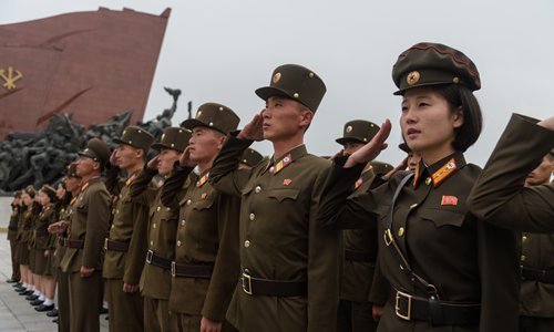Korean People's Army soldiers salute as they visit the statues of late North Korean leaders Kim Il-sung and Kim Jong-il on Mansu Hill on the 74th founding anniversary of the Workers' Party of Korea on Thursday. Photo: AFP