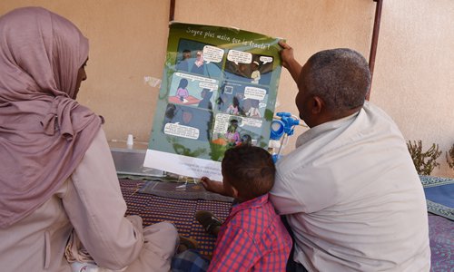 A refugee family who was evacuated from Libya look at an awareness poster at a UNHCR office in Niamey, Niger on Friday. Photo: AFP