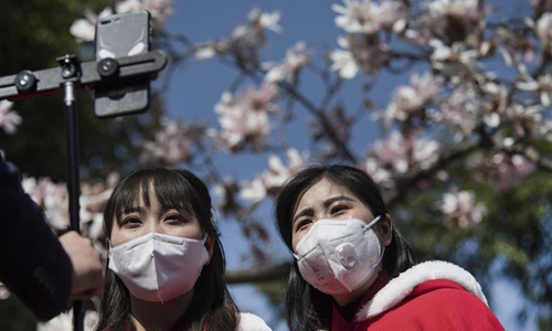 Staff show saucer magnolia via live broadcast at the Zhuge ancient town in Mianxian County of Hanzhong, northwest China's Shaanxi Province, March 3, 2020. The saucer magnolia at the Zhuge ancient town, which has been closed due to the novel coronavirus disease outbreak, is in full blossom. (Xinhua/Tao Ming)