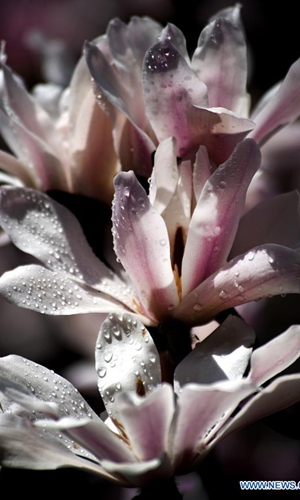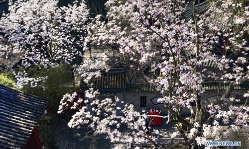 Photo taken on March 3, 2020 shows the saucer magnolia at the Zhuge ancient town in Mianxian County of Hanzhong, northwest China's Shaanxi Province. The saucer magnolia at the Zhuge ancient town, which has been closed due to the novel coronavirus disease outbreak, is in full blossom. (Xinhua/Tao Ming)