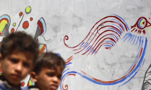 Children walk by graffiti in a street in Sanaa, Yemen, March 3, 2020. Yemeni activists in Sanaa held on Tuesday a graffiti drawing campaign calling for peace and appealing to all Yemen's warring parties to sit on the negotiation table and work together to end the ongoing war. (Photo by Mohammed Mohammed/Xinhua)