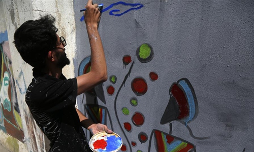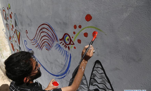 A man draws a graffiti on the wall in Sanaa, Yemen, March 3, 2020. Yemeni activists in Sanaa held on Tuesday a graffiti drawing campaign calling for peace and appealing to all Yemen's warring parties to sit on the negotiation table and work together to end the ongoing war. (Photo by Mohammed Mohammed/Xinhua)