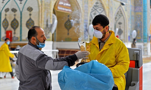 An Iraqi man blesses a worker, wearing a mask, with incense on Tuesday in the courtyard of the shrine of Imam Ali in the holy Iraqi city of Najaf, where the first case of COVID-19 has been documented in Iraq. Photo: AFP