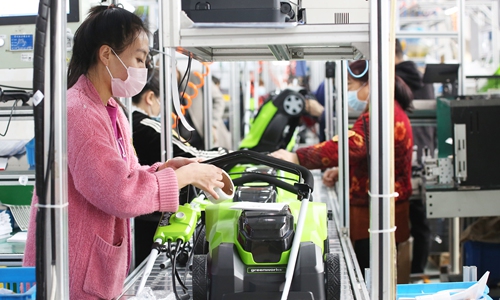 Workers are busy producing lawn-mowers at a company in Changzhou, East China's Jiangsu Province on Wednesday. To secure export supplies, most of the staff have returned to the factory and they're working overtime. Photo: cnsphotos