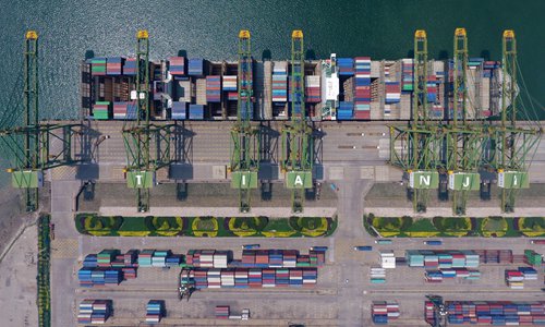 Tianjin Port, the largest comprehensive port in North China, as seen on Monday. Throughput at the facility exceeded 9.5 million containers as of this month. The port expanded the coverage of 5G network and successfully implemented remote control of container quay bridges through the network. It aims to become a fully automated container terminal through technologies like artificial intelligence. Photo: IC