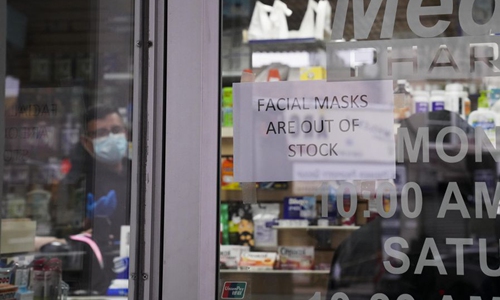 A notice showing "facial masks are out of stock" is seen on a door of a pharmacy in New York, the United States, Feb. 29, 2020. (Xinhua/Wang Ying)