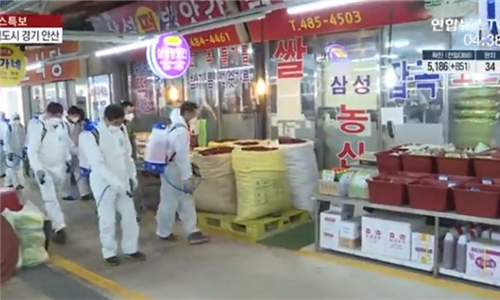 People in Ansan disinfect a local market. (Photo: Screenshot from Yonhap News Agency TV footage)