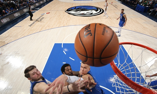 Derrick Favors (center) of the New Orleans Pelicans shoots the ball between Luka Doncic (left) and Kristaps Porzingis of the Dallas Mavericks on Wednesday in Dallas. Photo: VCG