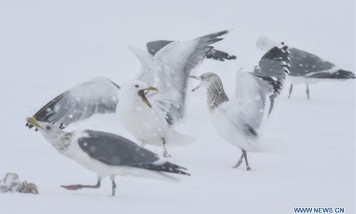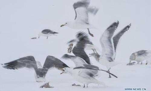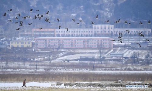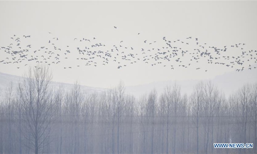 Wild geese fly over the Jingxin wetland in Hunchun City, northeast China's Jilin Province, March 3, 2020. Tens of thousands of migratory birds flying back towards north pass by Jingxin wetland and forage here. (Xinhua/Xu Chang)